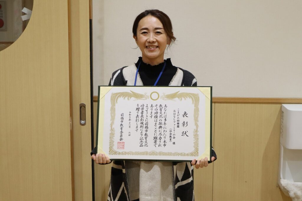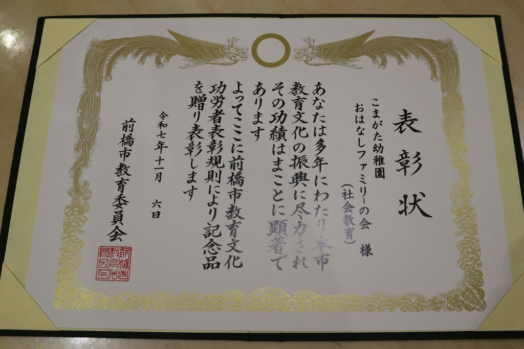 こまがた幼稚園では、保護者有志による「おはなしファミリーの会」(通称:おファミー)を活動していただいていますが、この度前橋市の教育文化功労賞受賞の運びとなりました。